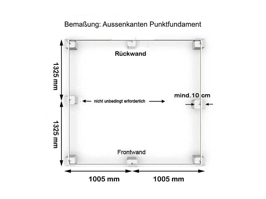 Sie können Ihr Gewächshaus auch auf einzelne Fundamentpunkte stellen und darauf befestigen. Es erfordert aber, dass Sie sich für einen Fundamentrahmen als Zubehör entschieden haben (gilt nur für Modellreihen ECRA, ORNA, DELCA)! Grundvoraussetzung für eine solche Befestigung ist allerdings, dass die Fundamentpunkte waagrecht sind. Punktfundamente sind nur auf flachen, ebenen Grundstücken geeignet! Wir empfehlen, die Fundamentpunkte an den vier Ecken des Gewächshauses zu setzen. Je nach Größe des Hauses empfehlen wir auch jeweils einen Fundamentpunkt an der Front- und Rückseite, sowie an den Längsseiten des Gewächshauses.