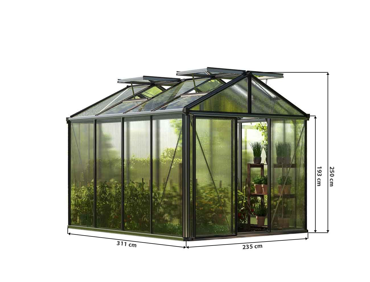 Das Gewächshaus DIAMAS 22 - PREMIUM präsentiert sich mit einer Breite von 235 cm und einer Länge von 311 cm, was eine Gesamtfläche von 7,31 m² ergibt. Seine Seitenwandhöhe von 193 cm und die Firsthöhe von 250 cm bieten optimalen Raum für hochwachsende Pflanzen. Ausgestattet mit vier Dachfenstern und einer Einfachschiebetür mit den Maßen 73 x 193 cm bietet es hervorragende Lüftungsmöglichkeiten. Die Verglasung erfolgt mit 16 mm Doppelstegplatten. Die Standardausführung in Alu natur kann wahlweise in Anthrazit RAL7016 oder GRÜN RAL6005, als pulverbeschichtete Aluminiumprofile, geliefert werden. Diese Option unterstreicht die Ästhetik und lässt das Gewächshaus harmonisch in Ihren Garten einfügen.