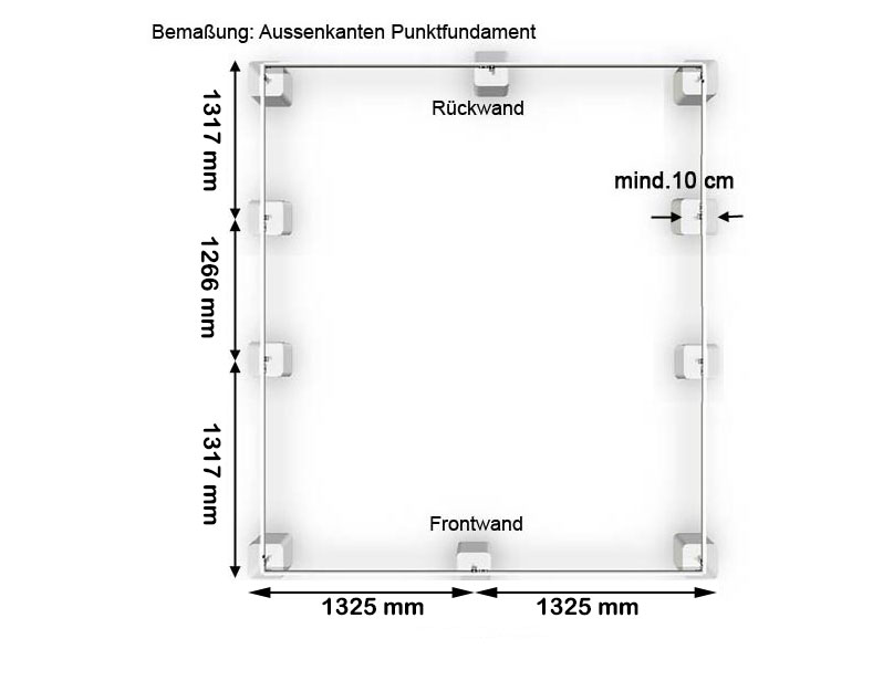 Sie können Ihr Gewächshaus auch auf einzelne Fundamentpunkte stellen und darauf befestigen. Es erfordert aber, dass Sie sich für einen Fundamentrahmen als Zubehör entschieden haben (gilt nur für Modellreihen ECRA, ORNA, DELCA)! Grundvoraussetzung für eine solche Befestigung ist allerdings, dass die Fundamentpunkte waagrecht sind. Punktfundamente sind nur auf flachen, ebenen Grundstücken geeignet! Wir empfehlen, die Fundamentpunkte an den vier Ecken des Gewächshauses zu setzen. Je nach Größe des Hauses empfehlen wir auch jeweils einen Fundamentpunkt an der Front- und Rückseite, sowie an den Längsseiten des Gewächshauses.
