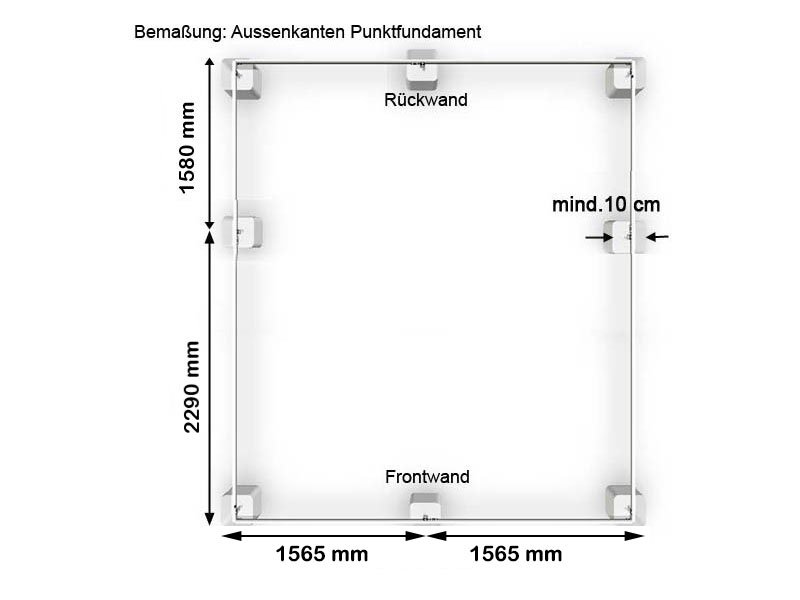Sie können Ihr Gewächshaus auch auf einzelne Fundamentpunkte stellen und darauf befestigen. Es erfordert aber, dass Sie sich für einen Fundamentrahmen als Zubehör entschieden haben (gilt nur für Modellreihen ECRA, ORNA, DELCA)! Grundvoraussetzung für eine solche Befestigung ist allerdings, dass die Fundamentpunkte waagrecht sind. Punktfundamente sind nur auf flachen, ebenen Grundstücken geeignet! Wir empfehlen, die Fundamentpunkte an den vier Ecken des Gewächshauses zu setzen. Je nach Größe des Hauses empfehlen wir auch jeweils einen Fundamentpunkt an der Front- und Rückseite, sowie an den Längsseiten des Gewächshauses.