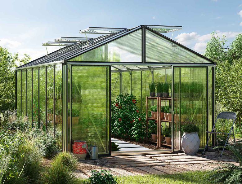 Unsere Gewächshäuser werden mit hochwertigen Doppelstegplatten aus Polycarbonat ausgestattet, die viele Vorteile mit sich bringen. Ihre Robustheit, Bruchsicherheit und Widerstandsfähigkeit gegen Witterungseinflüsse machen sie zu einer langlebigen Wahl, auf die wir 15 Jahre Garantie geben. Mit hoher Lichtdurchlässigkeit und exzellenten Wärmedämmeigenschaften sorgen sie für optimale Wachstumsbedingungen. Sie filtern schädliche UV-Strahlen und zerstreuen das Licht, um ein Brennglaseffekt zu vermeiden. Trotz ihrer robusten Eigenschaften sind sie leicht, was die Installation vereinfacht und zur Gesamtsicherheit beiträgt. Zudem sind sie recyclebar, unterstützend für die Nachhaltigkeitsziele.
