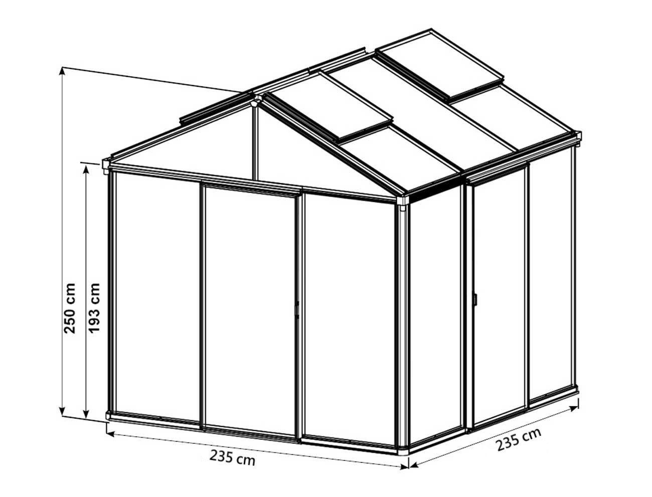 Das "GEWÄCHSHAUS DIAMAS 21 - ALLTOP" bietet mit einer Breite und Länge von je 235 cm auf einer Fläche von 5,52 m² ausreichend Platz für Ihr grünes Paradies. Die Seitenwandhöhe beträgt beeindruckende 193 cm, die Firsthöhe misst 250 cm. Ausgestattet ist es mit vier Dachfenstern und einer Einfachschiebetür von 73 x 193 cm, die optional an der Seiten- oder Rückwand montiert werden kann. Für Langlebigkeit und Robustheit sorgen die 16 mm Polycarbonat Doppelstegplatten, die optional durch ALLTOP Platten ersetzt werden können. Die Ausführung in Alu natur, wahlweise auch in Anthrazit RAL7016 oder GRÜN RAL6005 erhältlich, rundet das edle Design ab und lässt es sich harmonisch in jeden Garten einfügen.