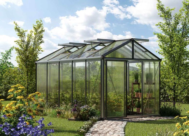 Das Gewächshaus DIAMAS 23 - PREMIUM misst in der Breite 235 cm und in der Länge 385 cm, was einer Gesamtfläche von 9,05 m² entspricht. Die Seitenwände sind mit einer Höhe von 193 cm außergewöhnlich hoch und bieten somit auch hochwachsenden Pflanzen ausreichend Platz. Die Firsthöhe beträgt 250 cm. Das Modell ist mit vier Dachfenstern ausgestattet und verfügt über eine Einfachschiebetür mit den Maßen 73 x 193 cm. Die Verglasung besteht aus 16 mm dicken Doppelstegplatten. Das Gewächshaus ist in der Ausführung Alu natur erhältlich, kann aber auch in Anthrazit RAL7016 oder GRÜN RAL6005 gewählt werden. Dabei handelt es sich um pulverbeschichtete Aluminiumprofile, die für eine ästhetische Optik sorgen.
