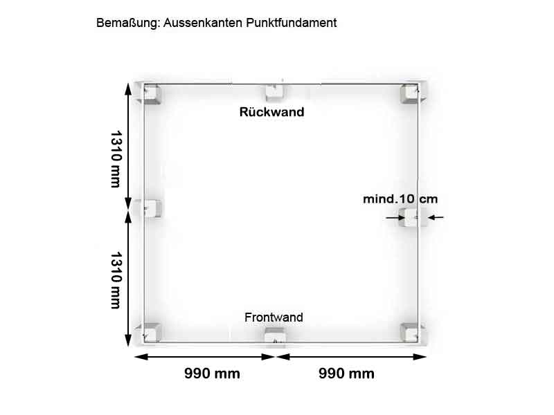Sie können Ihr Gewächshaus auch auf einzelne Fundamentpunkte stellen und darauf befestigen. Es erfordert aber, dass Sie sich für einen Fundamentrahmen als Zubehör entschieden haben (gilt nur für Modellreihen ECRA, ORNA, DELCA)! Grundvoraussetzung für eine solche Befestigung ist allerdings, dass die Fundamentpunkte waagrecht sind. Punktfundamente sind nur auf flachen, ebenen Grundstücken geeignet! Wir empfehlen, die Fundamentpunkte an den vier Ecken des Gewächshauses zu setzen. Je nach Größe des Hauses empfehlen wir auch jeweils einen Fundamentpunkt an der Front- und Rückseite, sowie an den Längsseiten des Gewächshauses.