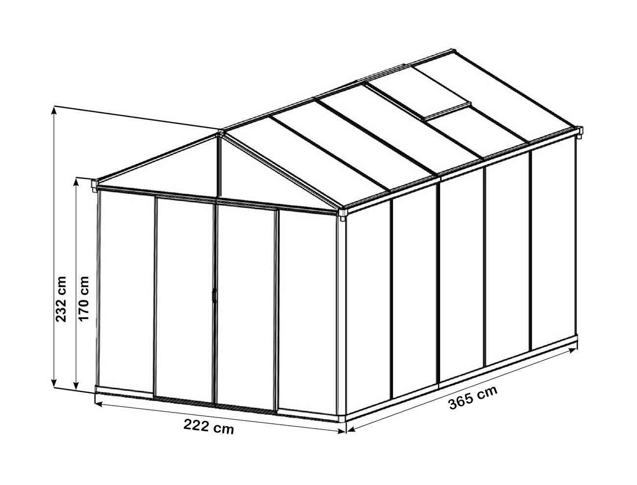 Das TITAN 23 ist ein wahrhaft beeindruckendes Gewächshaus. Es erstreckt sich über eine Breite von 222 cm und eine Länge von 365 cm, was eine Nutzfläche von 8,10 m² bietet. Die Seitenwände mit einer Höhe von 170 cm und einer Firsthöhe von 232 cm ermöglichen ein üppiges Wachstum, selbst für hochwachsende Pflanzen wie Tomaten. Mit zwei Dachfenstern für eine effiziente Belüftung und einer großzügigen Doppelschiebetür (120 x 175 cm) für einen einfachen Zugang ist es optimal ausgestattet. Die Verglasung aus 10 mm dicken Doppelstegplatten garantiert Wärmeisolierung und Sicherheit. Das Ganze wird in der natürlichen Aluminium-Ausführung geliefert.
