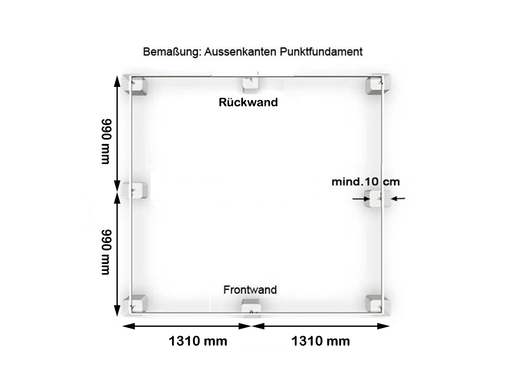 Sie können Ihr Gewächshaus auch auf einzelne Fundamentpunkte stellen und darauf befestigen. Es erfordert aber, dass Sie sich für einen Fundamentrahmen als Zubehör entschieden haben (gilt nur für Modellreihen ECRA, ORNA, DELCA)! Grundvoraussetzung für eine solche Befestigung ist allerdings, dass die Fundamentpunkte waagrecht sind. Punktfundamente sind nur auf flachen, ebenen Grundstücken geeignet! Wir empfehlen, die Fundamentpunkte an den vier Ecken des Gewächshauses zu setzen. Je nach Größe des Hauses empfehlen wir auch jeweils einen Fundamentpunkt an der Front- und Rückseite, sowie an den Längsseiten des Gewächshauses.