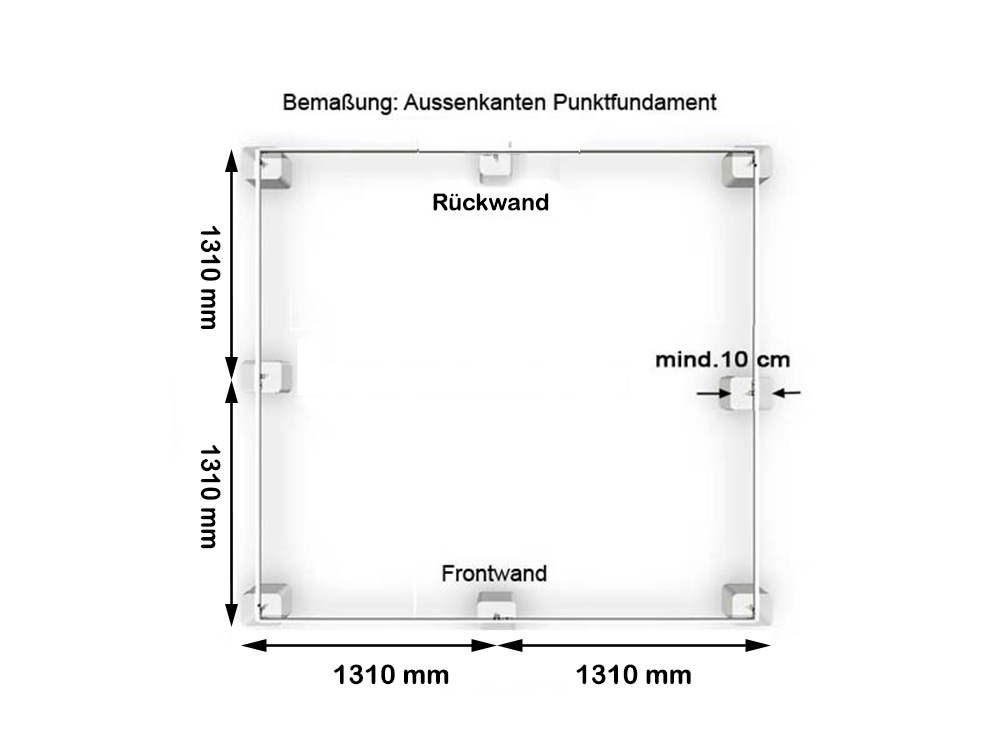 Sie können Ihr Gewächshaus auch auf einzelne Fundamentpunkte stellen und darauf befestigen. Es erfordert aber, dass Sie sich für einen Fundamentrahmen als Zubehör entschieden haben (gilt nur für Modellreihen ECRA, ORNA, DELCA)! Grundvoraussetzung für eine solche Befestigung ist allerdings, dass die Fundamentpunkte waagrecht sind. Punktfundamente sind nur auf flachen, ebenen Grundstücken geeignet! Wir empfehlen, die Fundamentpunkte an den vier Ecken des Gewächshauses zu setzen. Je nach Größe des Hauses empfehlen wir auch jeweils einen Fundamentpunkt an der Front- und Rückseite, sowie an den Längsseiten des Gewächshauses.