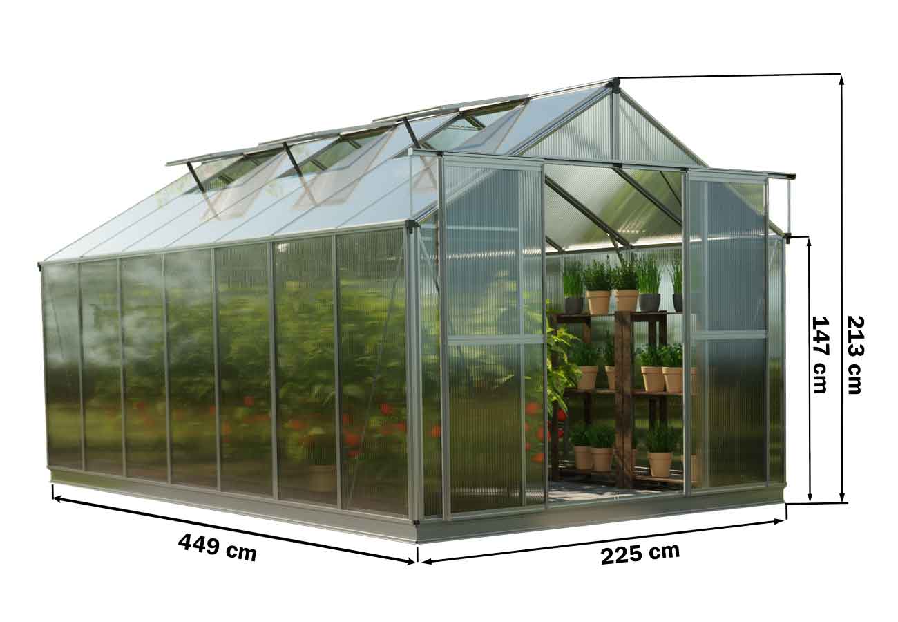 Das TOPAS 7 Glashaus, ein prächtiges Modell mit einer Breite von 225 cm und einer bemerkenswerten Länge von 449 cm, eröffnet mit einer Fläche von 10,1 m² eine reiche Landschaft für Ihre grünen Mitbewohner. Mit einer Seitenwandhöhe von 147 cm, die sich zur Firsthöhe von 213 cm hin ausdehnt, bietet es ein Gefühl von Weite und Offenheit. Ausgestattet mit drei Dachfenster und einer großzügig bemessenen Doppelschiebetür mit den Abmessungen 108 x 172 cm, vervollständigen die 6 mm oder 8 mm dicken Doppelstegplatten und die aluminiumfarbene Ausführung die bemerkenswerten technischen Merkmale.