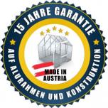 Auf die Konstruktion, Verarbeitung und Materialqualität gewähren wir Ihnen 15 Jahre Garantie. Auf die Verglasung mit 6mm Stegplatten bieten wir 10 Jahren Garantie auf Lichtdurchlässigkeit und Bruchbeständigkeit.