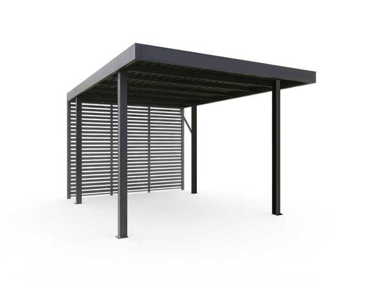 Unsere Jalousiewand kann flexibel an jeder gewünschten Seitenwand angebracht werden. Die feste Lamellenstruktur sorgt für eine wartungsarme Nutzung ohne bewegliche Teile.