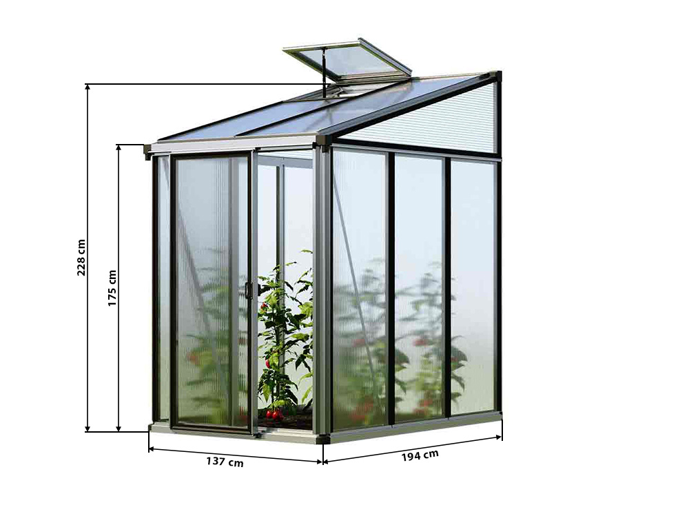 Das ELLA 32 Anlehngewächshaus überzeugt mit seiner robusten Konstruktion und der hochwertigen 16 mm Doppelstegplatten-Verglasung. Hergestellt aus stabilen Aluminiumrahmen, garantiert es Langlebigkeit und Widerstand gegen Wind und Wetter. Perfekt für den ambitionierten Gärtner, der ohne Kompromisse in Qualität und Design investieren möchte. Seine kompakte Größe macht es ideal für kleine Gärten oder als Spezialgewächshaus für bestimmte Pflanzen. Mit 15 Jahren Garantie auf Konstruktion und 10 Jahren auf Verglasung verspricht das ELLA 32 dauerhafte Qualität und Schutz für Ihre Pflanzen. Ein Meisterwerk der Gartentechnik, das Funktionalität und ästhetischen Wert elegant vereint.