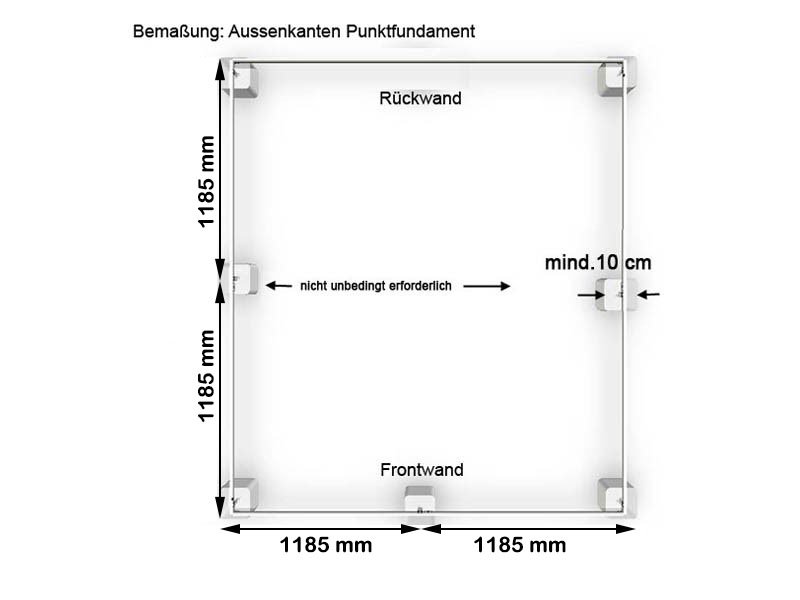 Sie können Ihr Gewächshaus auch auf einzelne Fundamentpunkte stellen und darauf befestigen. Es erfordert aber, dass Sie sich für einen Fundamentrahmen als Zubehör entschieden haben (gilt nur für Modellreihen ECRA, ORNA, DELCA)! Grundvoraussetzung für eine solche Befestigung ist allerdings, dass die Fundamentpunkte waagrecht sind. Punktfundamente sind nur auf flachen, ebenen Grundstücken geeignet! Wir empfehlen, die Fundamentpunkte an den vier Ecken des Gewächshauses zu setzen. Je nach Größe des Hauses empfehlen wir auch jeweils einen Fundamentpunkt an der Front- und Rückseite, sowie an den Längsseiten des Gewächshauses.