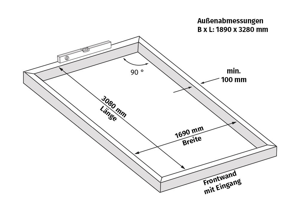 Ein mindestens 10 cm starker Betonstreifen stellt das optimale Fundament dar. Am einfachsten ist das Errichten eines Betonfundamentes, wenn man dafür Schalsteine aus dem Baumarkt verwendet. Diese werden entsprechend der benötigten Abmessungen aufgestellt, ausgerichtet und anschließend mit Beton aufgefüllt. Grundsätzlich ist das Fundament frostsicher, also 80 cm tief zu errichten. Fragen Sie am besten einen Fachmann Ihres Vertrauens,ob in Ihrem Gebiet auch ein weniger tiefes Fundament ausreicht. Die ideale Bemaßung für das Fundament finden Sie auf dieser Seite ganz unten.