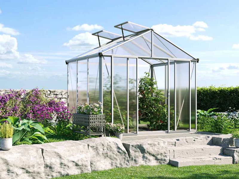 Mit einer 15-jährigen Garantie auf die Aluminiumkonstruktion und einer 10-jährigen Garantie auf die Doppelstegplatten ist das RUBIN 3 Gewächshaus ein Zeichen von Qualität und Haltbarkeit, das Ihrem Garten nicht nur einen Mehrwert, sondern auch einen optischen Höhepunkt hinzufügt.