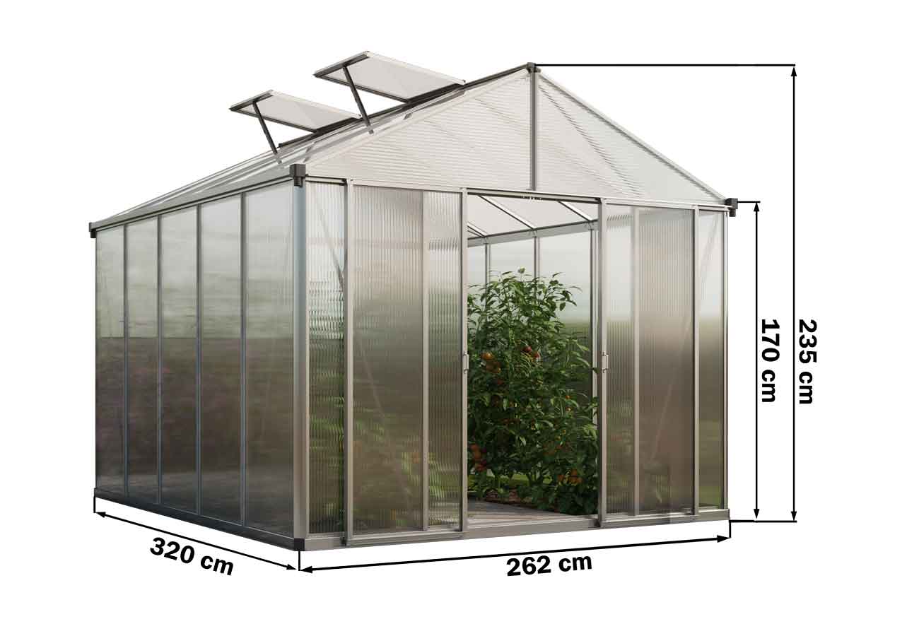 Mit einer Breite von 262 cm und einer Länge von 320 cm erstreckt sich das "Rubin 5" über eine Gesamtfläche von 8,38 m², womit es reichlich Raum für Ihr Gartenparadies bietet. Es prahlt mit einer Seitenwandhöhe von 170 cm und einer Firsthöhe von 235 cm, was optimalen Platz für hochwachsende Pflanzen wie Tomaten bietet. Die Doppelschiebetür (120 x 175 cm) gewährt problemlosen Zutritt, während zwei Dachfenster für ausreichende Belüftung sorgen. Eine 10 mm dicke Verglasung aus Doppelstegplatten und eine robuste Alu-natur Ausführung runden das Paket ab. -