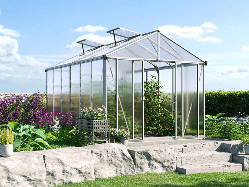 Die RUBIN 6 Gewächshäuser zeichnen sich durch eine robuste und langlebige Aluminiumkonstruktion aus. Die Konstruktion bietet eine langlebige Korrosionsbeständigkeit. Die Doppelstegplatten sind sicher eingefasst, nicht nur punktuell befestigt, und garantieren somit einen einzigartigen Halt. UV-beständige Kunststoffclips gewährleisten eine feste Verankerung, selbst bei starken Stürmen. Die integrierten Dachrinnen, Windverbände, hochwertige PVC-Klickprofile und rostfreie Edelstahlschrauben sorgen für zusätzliche Stabilität und Haltbarkeit. Das optimierte Design maximiert die Lichtdurchlässigkeit und schützt gleichzeitig vor UV-Strahlen, was das Pflanzenwachstum begünstigt. -