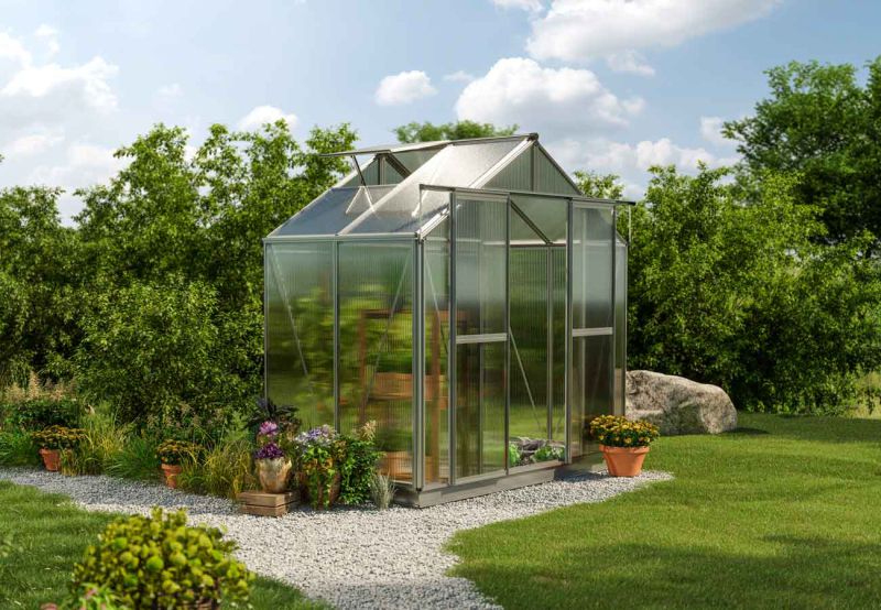 Im "SAPHIR 2" vereinen wir höchste Materialqualität mit handwerklicher Genauigkeit. Unser Gewächshausrahmen aus Aluminium ist robust, langlebig und wetterfest, was eine beständige Leistung über viele Jahre hinweg gewährleistet. Darüber hinaus ist Aluminium korrosionsbeständig, wodurch das Gewächshaus seine attraktive Optik bewahrt. Doppelstegplatten aus Polycarbonat sorgen für eine hohe Lichtdurchlässigkeit, UV-Beständigkeit und ausgezeichnete Wärmeisolierung. Hochwertige Edelstahlschrauben stellen eine stabile Verbindung aller Elemente sicher. -