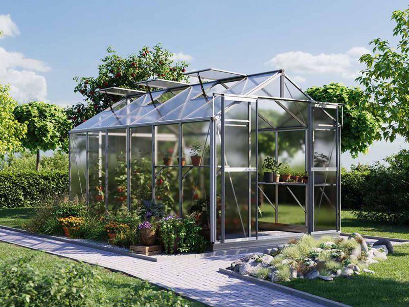 Auf Wunsch kann das Gewächshaus auch mit einem automatischen Fensteröffner bestückt werden, um das Gartenleben zu erleichtern. Und um das Ganze abzurunden, sind integrierte Dachrinnen vorhanden, die das Regenwasser effizient ableiten.
